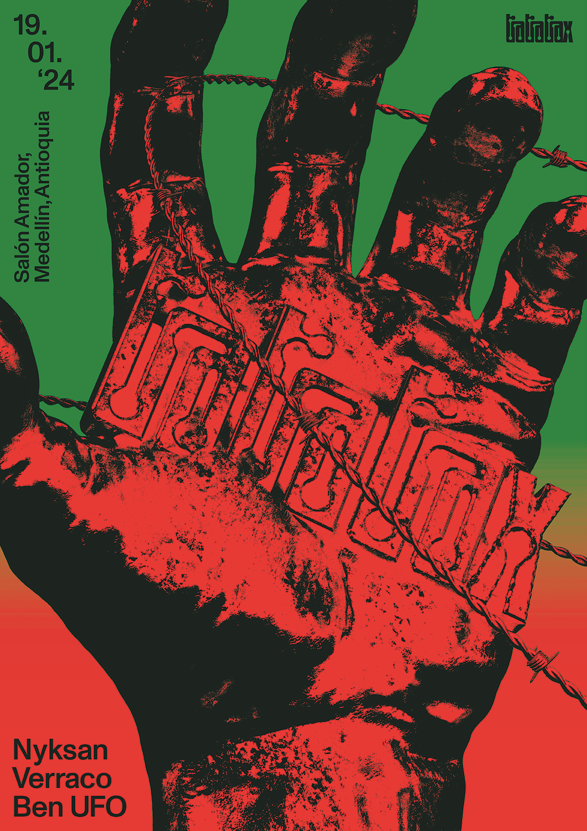 Poster design for the Tratratrax party in Medellín, Colombia. The party was hosting Ben UFO, Verraco and Nyksan.
